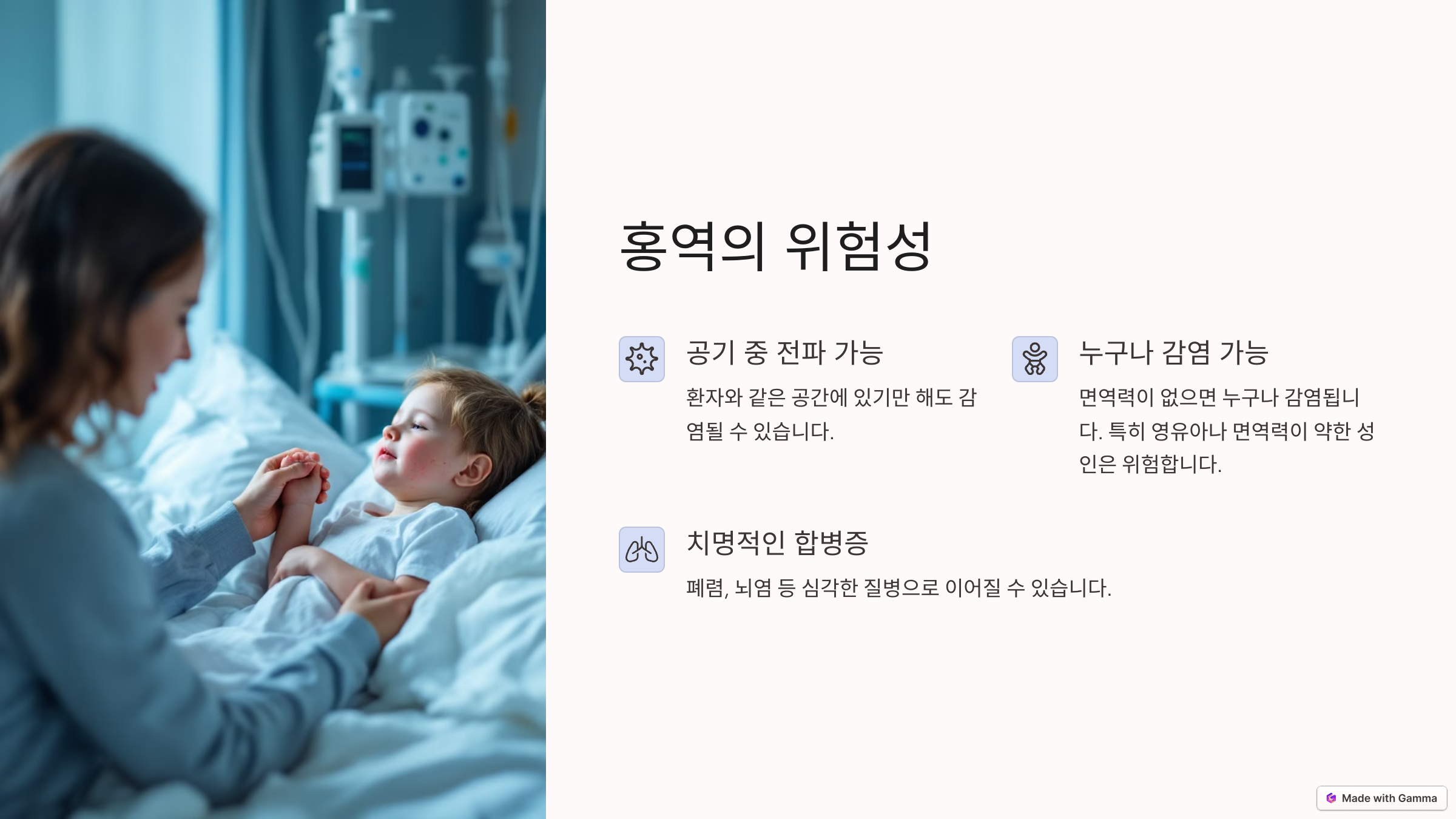 홍역은 단순한 감기가 아니라 심각한 합병증을 유발할 수 있는 위험한 질병입니다.