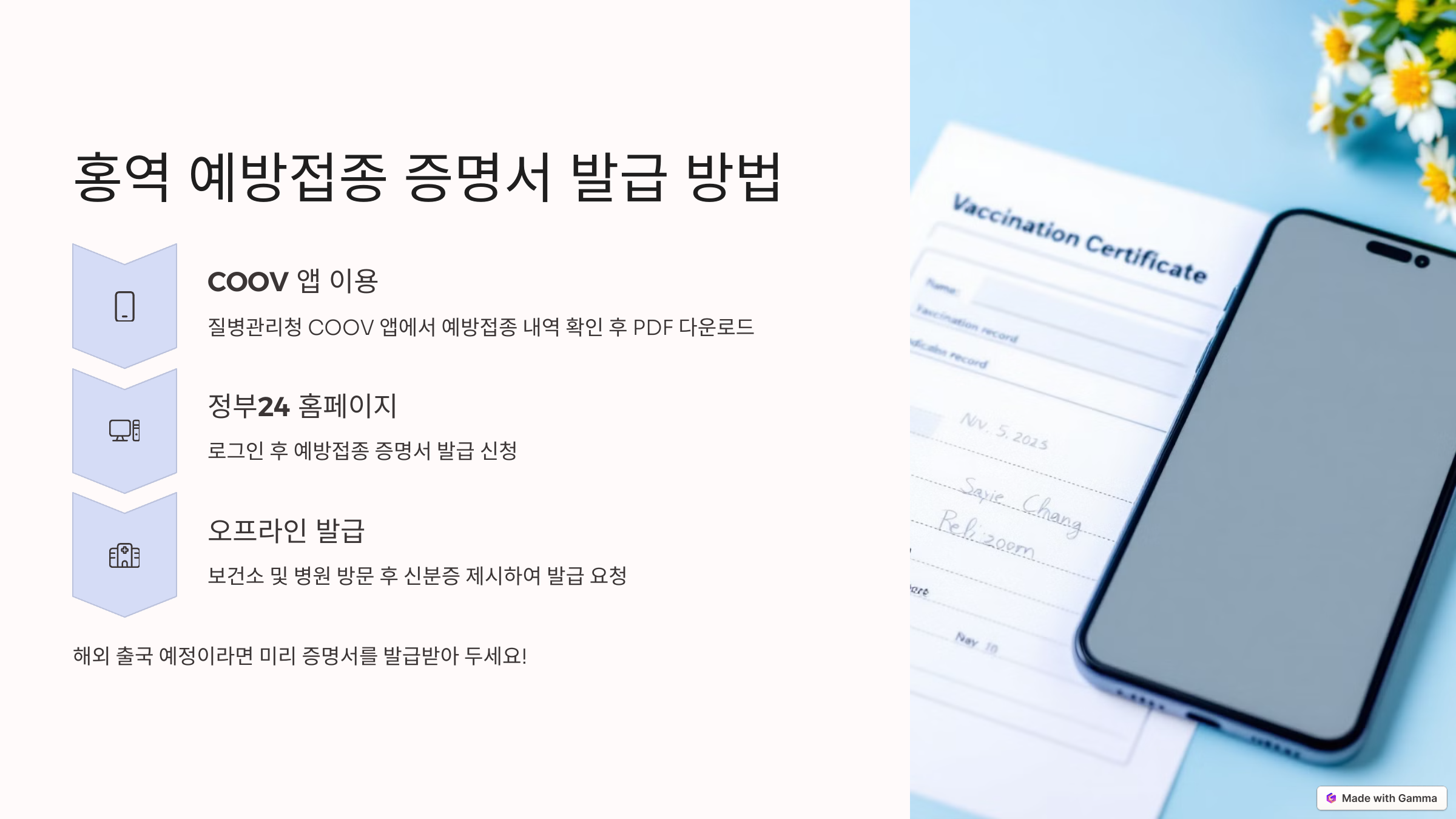 ※ 해외 출국, 학교 입학, 직장 제출 등을 위해 예방접종 증명서가 필요할 수 있습니다.